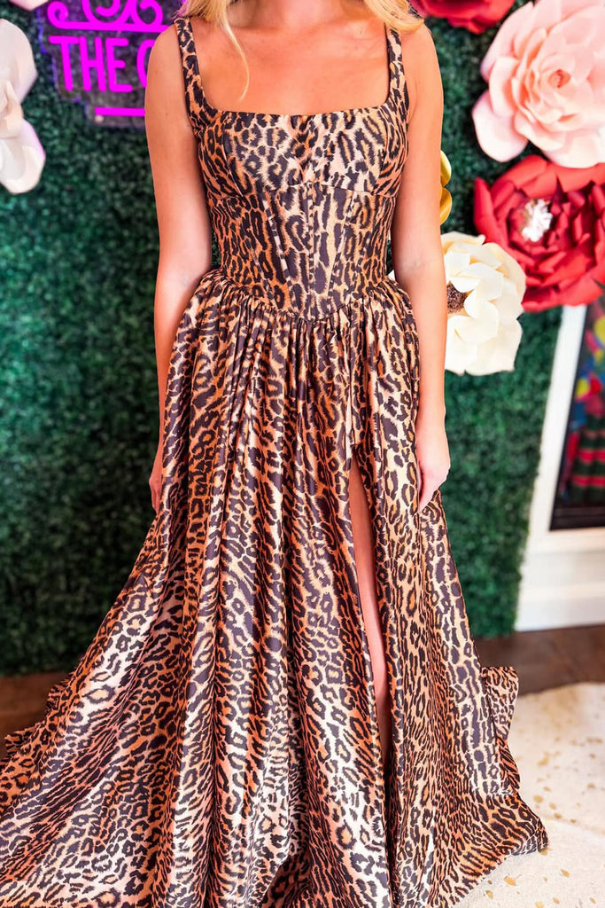 A-Line Square Neck Leopard Print Prom Dress with Slit AB021509