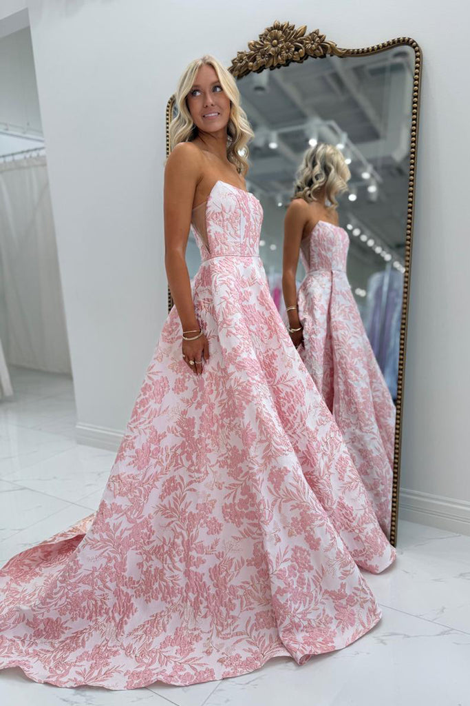 Charming A-Line Strapless Floral Jacquard Satin Prom Dress with Slit AB26020903
