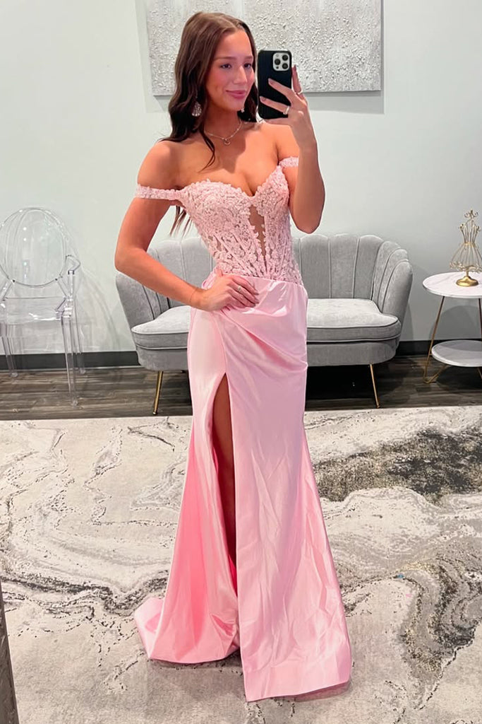 Charming Mermaid Off the Shoulder Pink Satin Prom Dress AB26011011