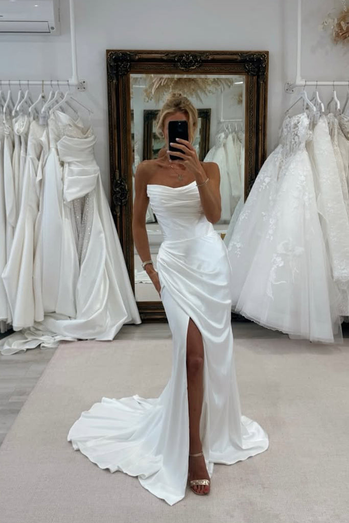 Charming Mermaid Scoop Neck Silk Satin Wedding Dress with Slit AB25112405