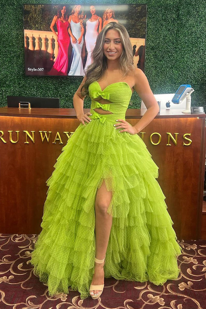 Chic A-Line Strapless Green Ruffle Tiered Tulle Long Prom Dress AB4050603