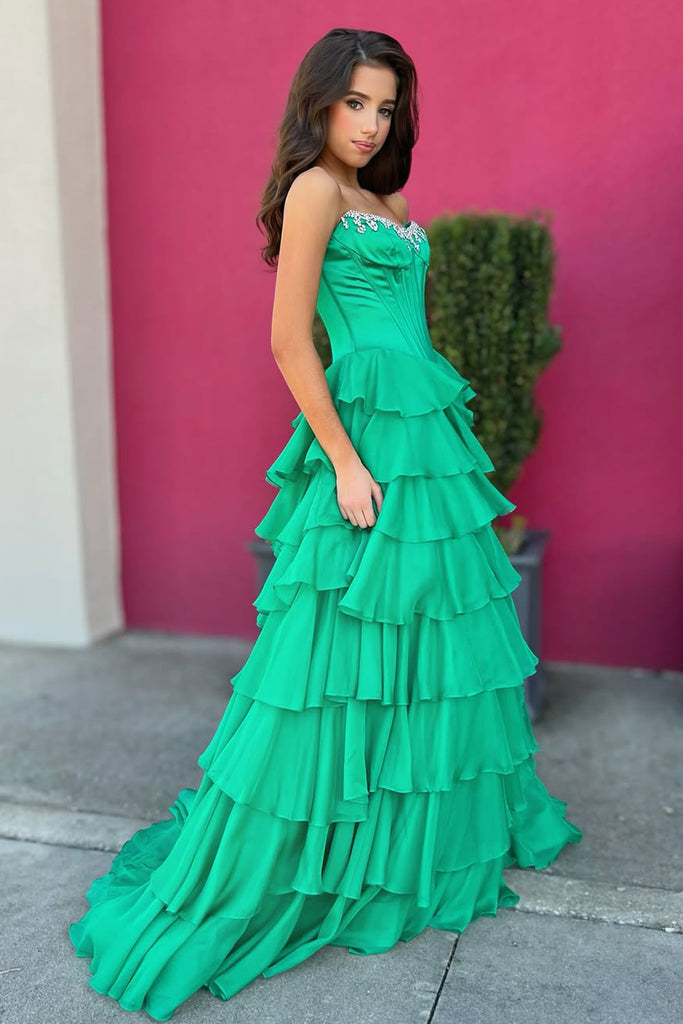 Cute A Line Scoop Neck Green Chiffon Tiered Prom Dress with Beading AB25112705