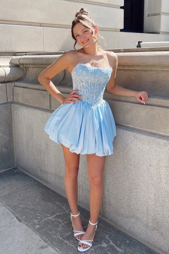 Cute A Line Scoop Neck Light Blue Satin Short Homecoming Dress with Appliques AB25102701