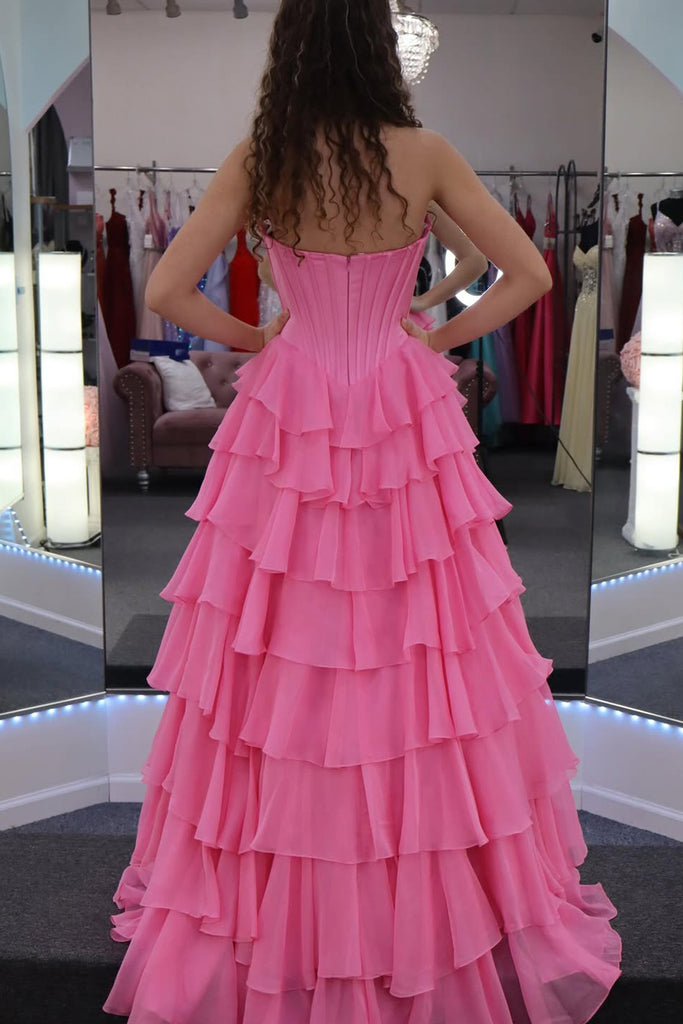 Cute A Line Scoop Neck Pink Chiffon Tiered Prom Dress with Slit AB26012414