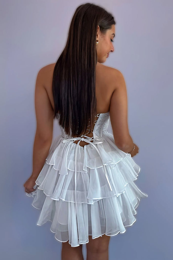Cute A Line Scoop Neck White Chiffon Tiered Homecoming Dress with Hot Stone Beading AB25073105