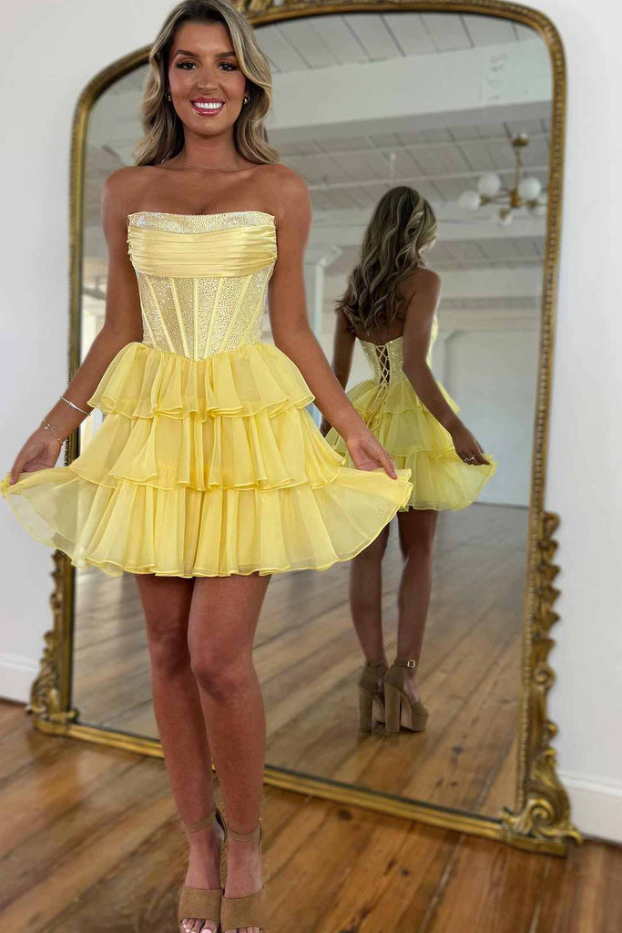 Shop the latest 2025 homecoming dresses, yellow tiered party dresses, and A-line scoop neck homecoming dresses now!