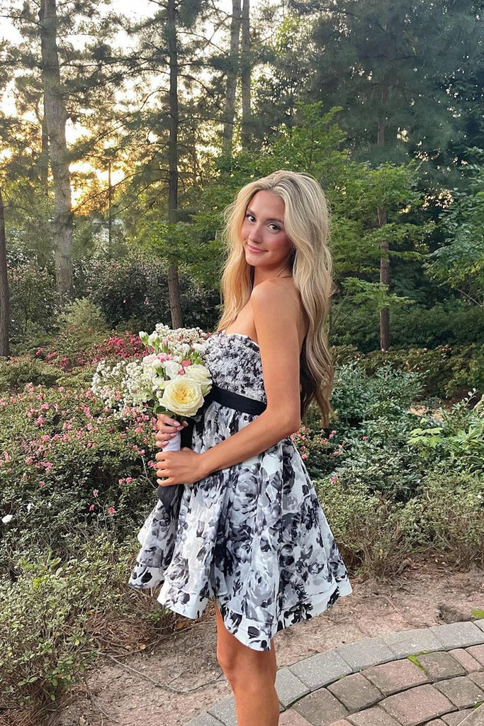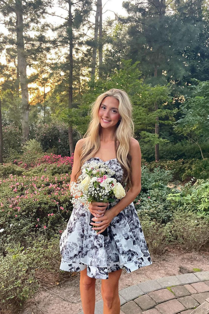 Cute A Line Sweetheart Black White Printed Chiffon Short Party Dresses AB24103007