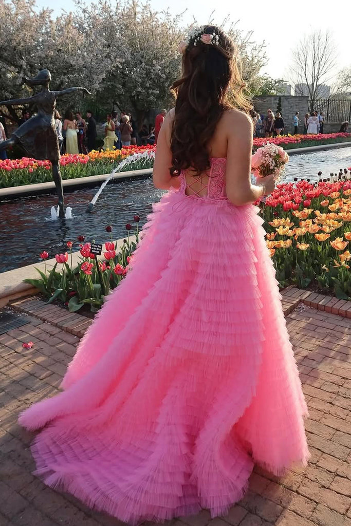 Cute Ball Gown Sweetheart Pink Tiered Tulle Prom Dress with Slit AB250534