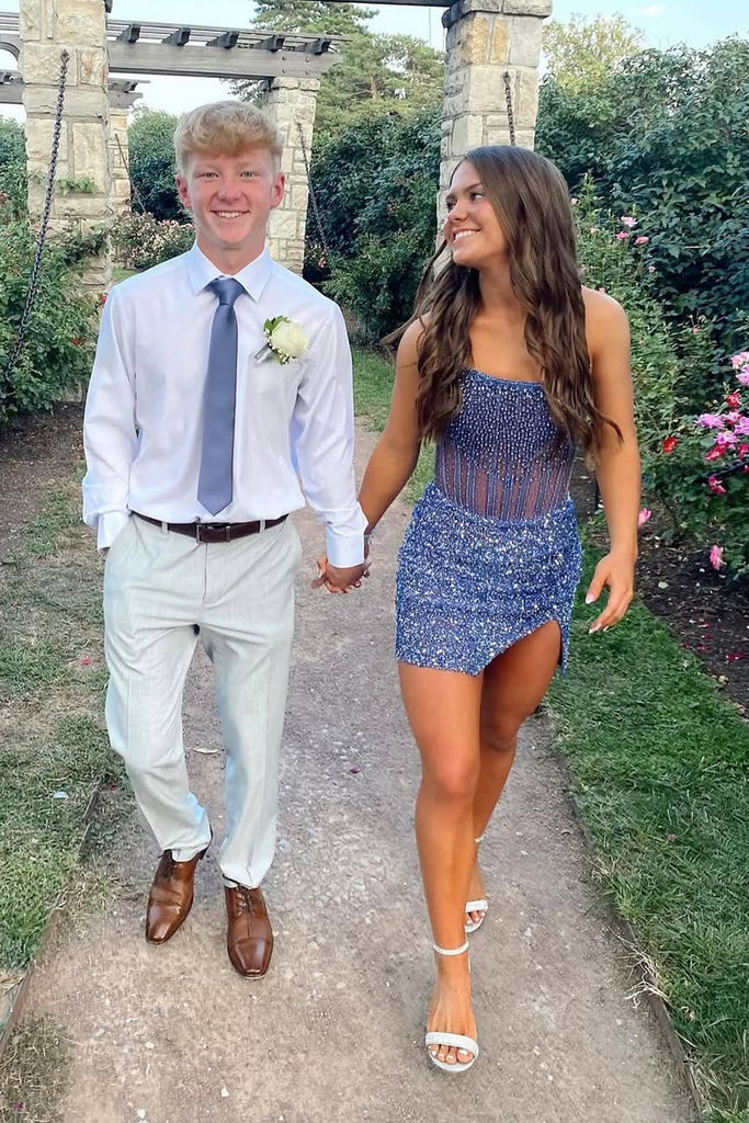 Cute Bodycon Scoop Neck Dark Blue Sequins Homecoming Dress with Beading AB25092510