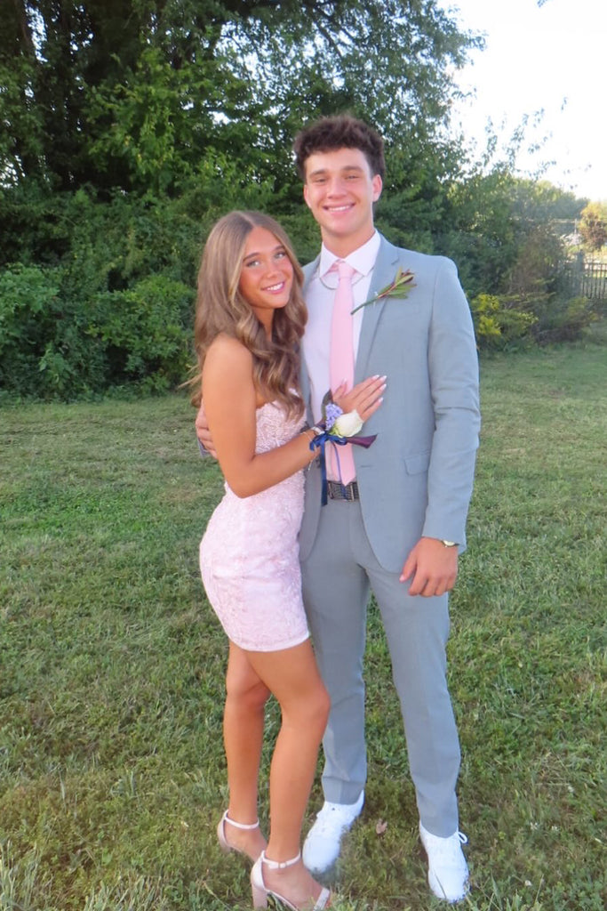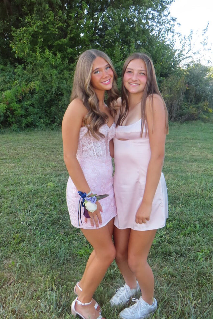 Cute Bodycon Sweetheart Pink Lace Short Homecoming Dress with Beading AB25092902