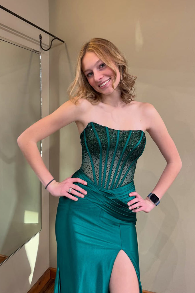 Cute Mermaid Scoop Neck Hot Fix Satin Prom Dress with Slit AB26012709