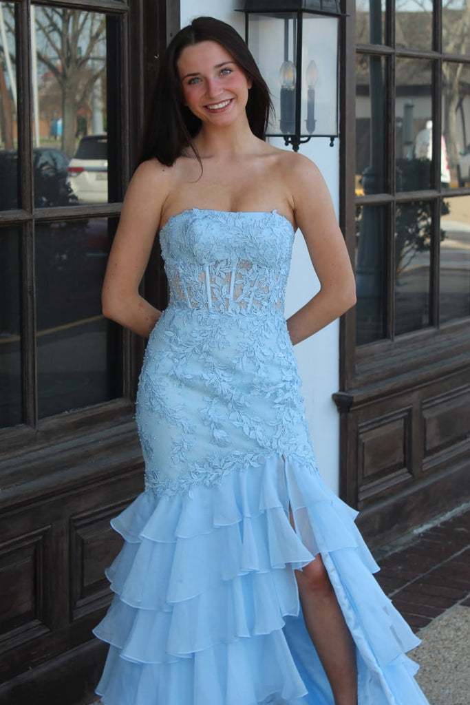 Cute Mermaid Sweetheart Light Blue Chiffon Tiered Prom Dress with Slit AB26030506