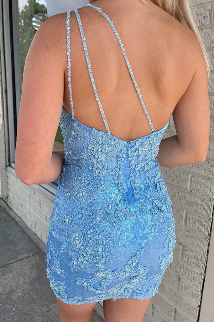 Fashion Cute One Shoulder Sparkly Light Blue Sequins Short Homecoming Dresses with Appliques AB081623