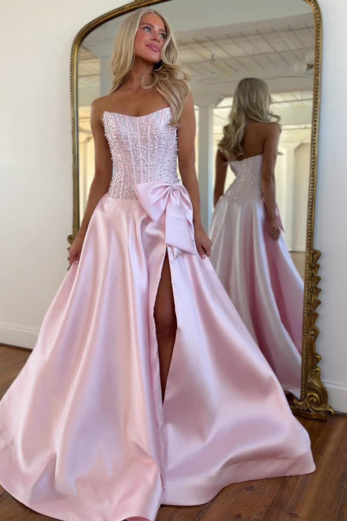 Gorgeous A Line Scoop Neck Pink Satin Beads Slit Prom Dress with Bow AB021515