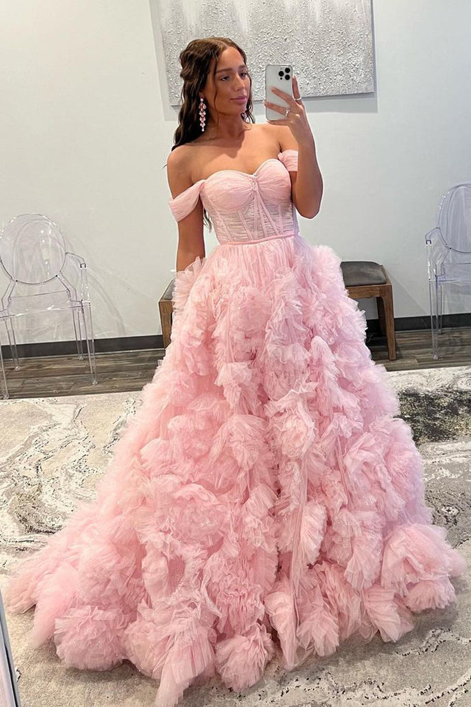 Gorgeous Ball Gown Off the Shoulder Pink Tulle Prom Dresses with Slit AB082407