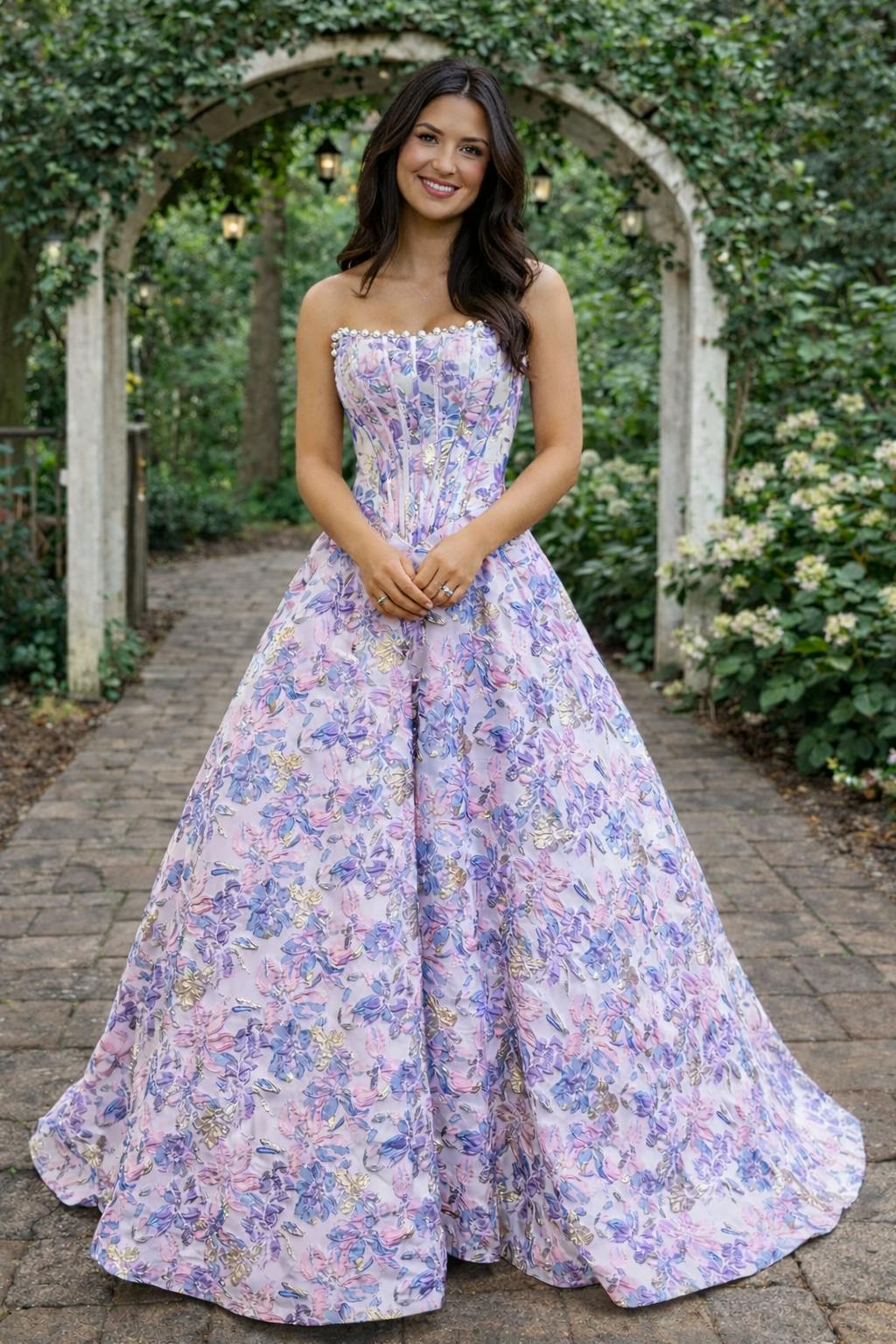 Gorgeous Ball Gown Scoop Neck Jacquard Satin Prom Dress with Pearls AB32122903