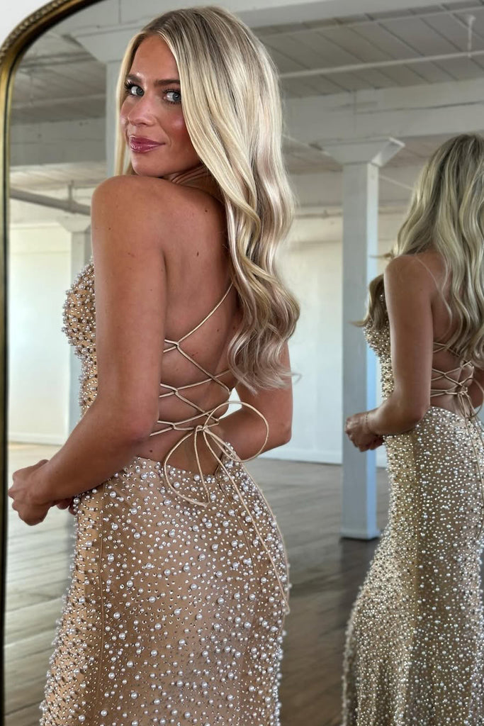 Gorgeous Mermaid V Neck Gold Pearls Prom Dress AB26010407