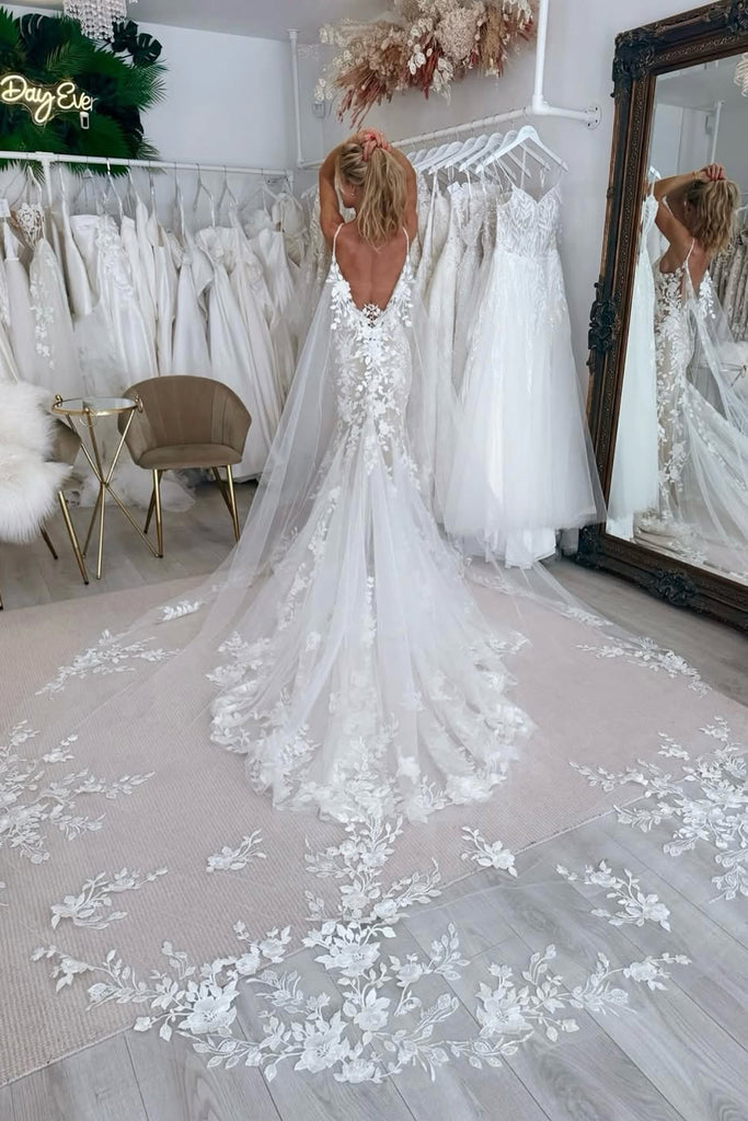 Stunning Mermaid V Neck Lace Tulle Wedding Dress with Appliques AB26022406